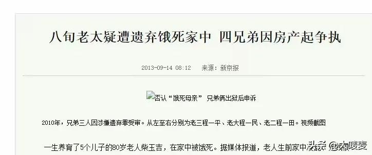2010年,北京通州人民检察院以遗弃罪对老大程一民、老二程一田、老三程一平提起公诉。据调查,老大程一民的伤势完全不影响照顾母亲;老二和老三明知有可能是自己的赡养期间却对母亲不闻不问。他们主观上就不想照顾老人。