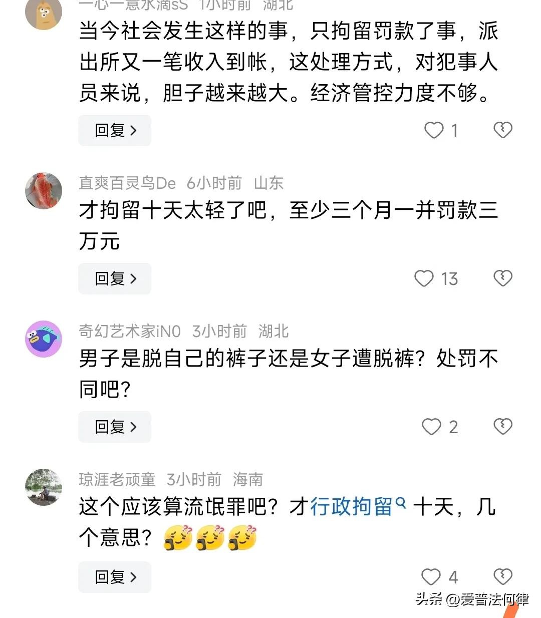 评论区中,不少网友纷纷留言:大庭广众之下扒女的裤子,才拘留十日?这处罚够重的!才拘留十天太轻了,至少三个月一并罚款三万元!
