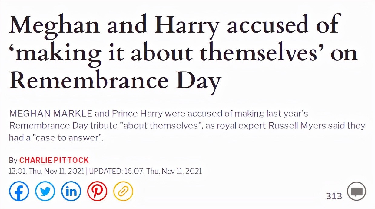 在11月11日,英媒发表了一篇报道,在报道之中,引用了某些王室专家与名人的对梅根夫妇的评论,评论认为,梅根夫妇在参加一个重要纪念活动时候,刻意宣传自己,吸引人们的关注。