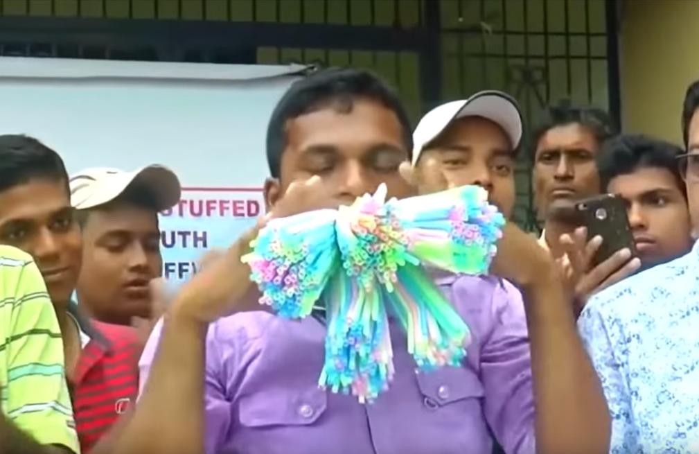 来自印度的大神库玛,用嘴咬住了459根吸管,并坚持10秒钟,成为世界上咬吸管最多的人,他为了这个记录,在家苦练了多年。