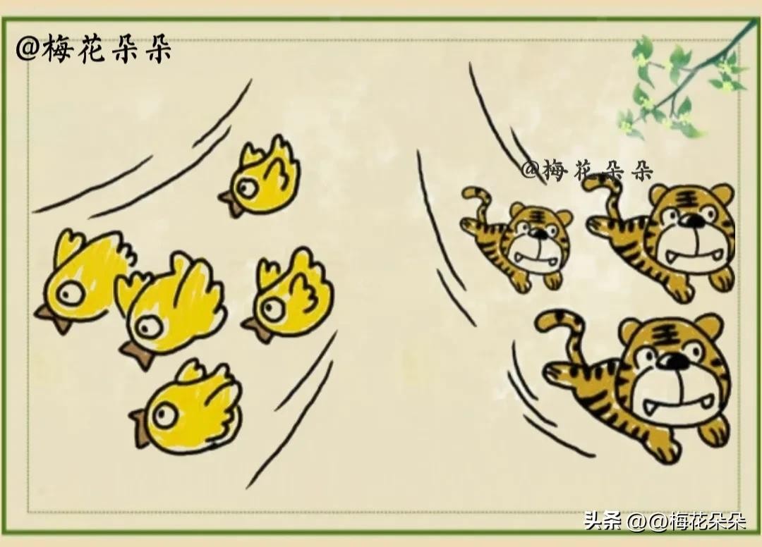 图片中发生了什么事,一群小鸟和一群老虎分散跑了。