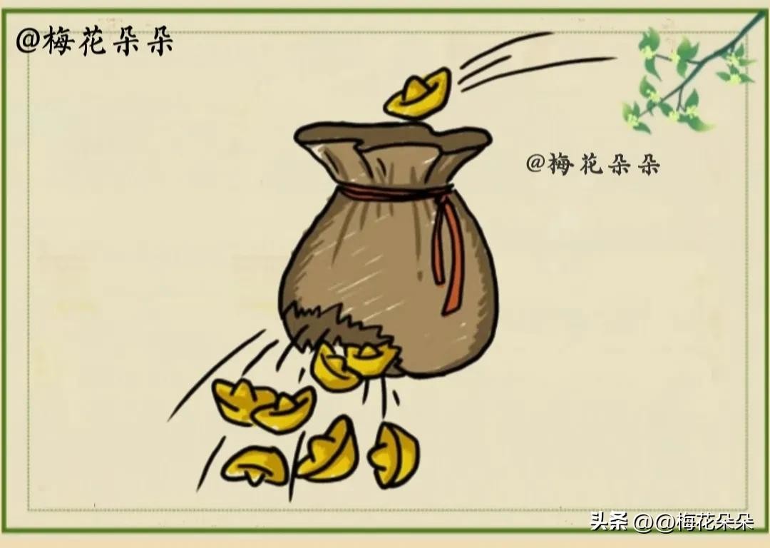 图片中有个底部破了的布袋,袋口中进一个金元宝,底部却掉出许多的元宝。