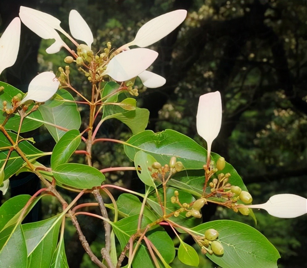香果树(学名:Emmenopterys henryi Oliv.)是茜草科、香果树属落叶大乔木高可达30米,树皮灰褐色,鳞片状;小枝粗壮有皮孔,叶纸质或革质,叶片阔椭圆形、阔卵形或卵状椭圆形,上面无毛或疏被糙伏毛,下面较苍白,托叶大,三角状卵形,圆锥状聚伞花序顶生;花芳香,裂片近圆形,变态的叶状萼裂片白色、淡红色或淡黄色,花冠漏斗形,白色或黄色,花丝被绒毛。蒴果长圆状卵形或近纺锤形,种子多数,6-8月开花,8-11月结果。