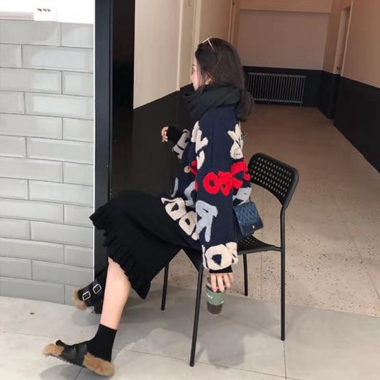 这一款是黑色打底的中长款毛衣,上身是蓝色的带有彩色印花字母图案使得这件衣服多了几分卡哇伊的感觉,我们的模特脖子上带了一款黑色的围巾,映衬出毛衣的颜色,这一件毛衣不是修身款,所以里面可以穿一些紧身的保暖内衣以作保暖之用。