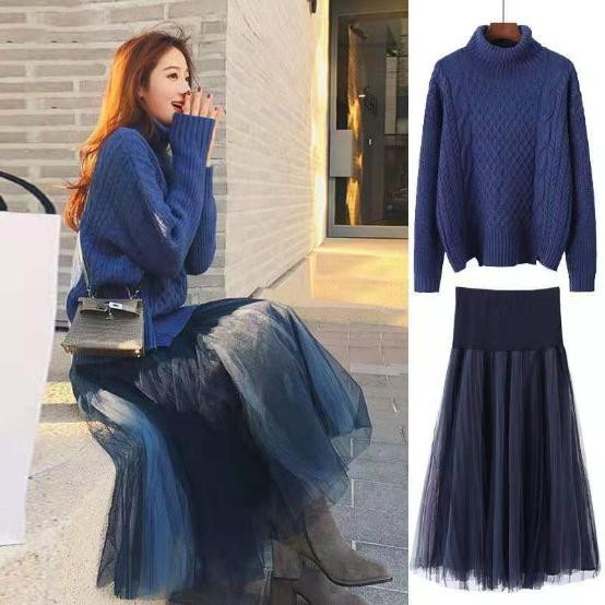 这是一款小编非常钟爱的宝石蓝色的套装,上衣是高领的毛衣,下身搭配蓝色的网纱裙,显的肤色格外白皙水嫩,而且网纱裙还有着很仙儿的特点,所以这一款衣服穿在身上,能够很好的起到减龄的效果,而且还增加了几分少女感和小清新的感觉。鞋子选择一款灰色的或者是黑色的高跟鞋都很好凸显这件衣服的特点。背上一款自己喜欢的小香包,走在步行街上,都是很好的街拍亮点。
