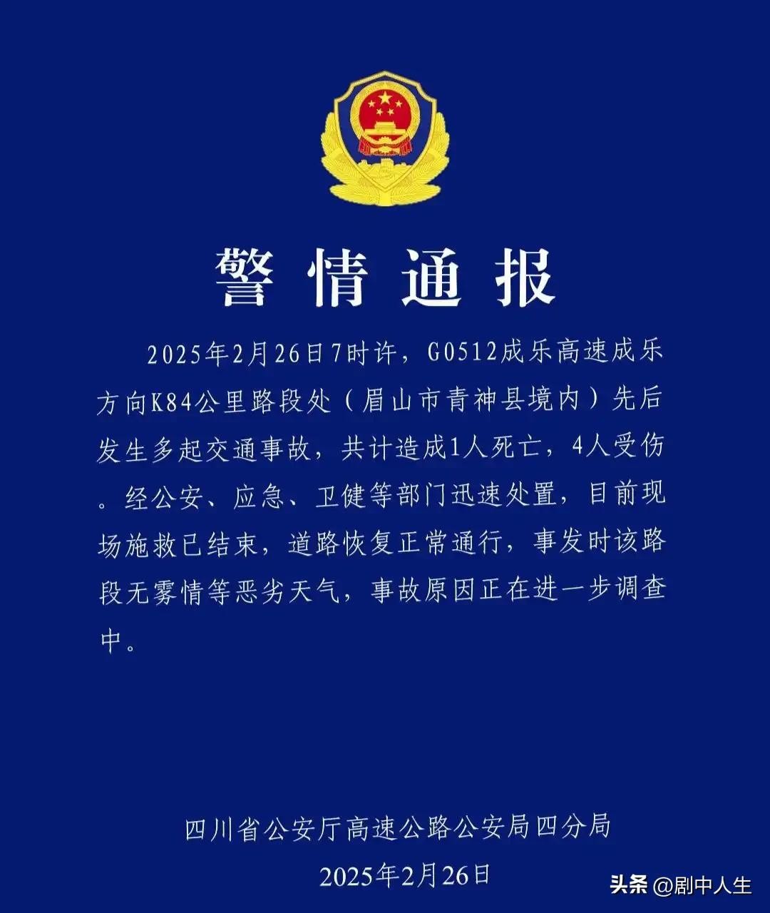 话说这事故发生的那天啊,是 2 月 26 日清晨 7 点左右。地点就在四川 G0512 成乐高速成乐方向 K84 公里路段。有个目击者后来讲起这事儿,那真是心有余悸啊!当时他正开着车在这段路上好好走着呢,突然,就听见前方传来一阵 “嘎吱嘎吱” 急促的刹车声,那声音就像有人在耳边尖叫,紧接着又是几声 “哐当哐当” 特别刺耳的撞击声,吓得他一哆嗦。这司机也是反应快,本能地就赶紧采取紧急制动措施,这才没让自己也卷入这场可怕的灾难里头。