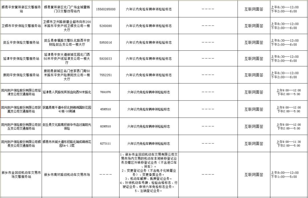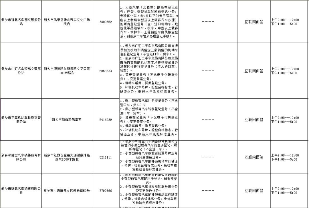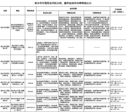 为全面推进全市车管所正规化建设,不断提高车辆和驾驶人管理服务效能,持续提高交管“放管服”工作水平,为企业营造良好营商环境,打造“人民满意车管所”。新乡市公安局交警支队现对全市办理车管所业务的服务点和服务项目进行公示,群众可以就近选择网点办理机动车和驾驶证业务。