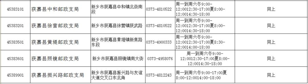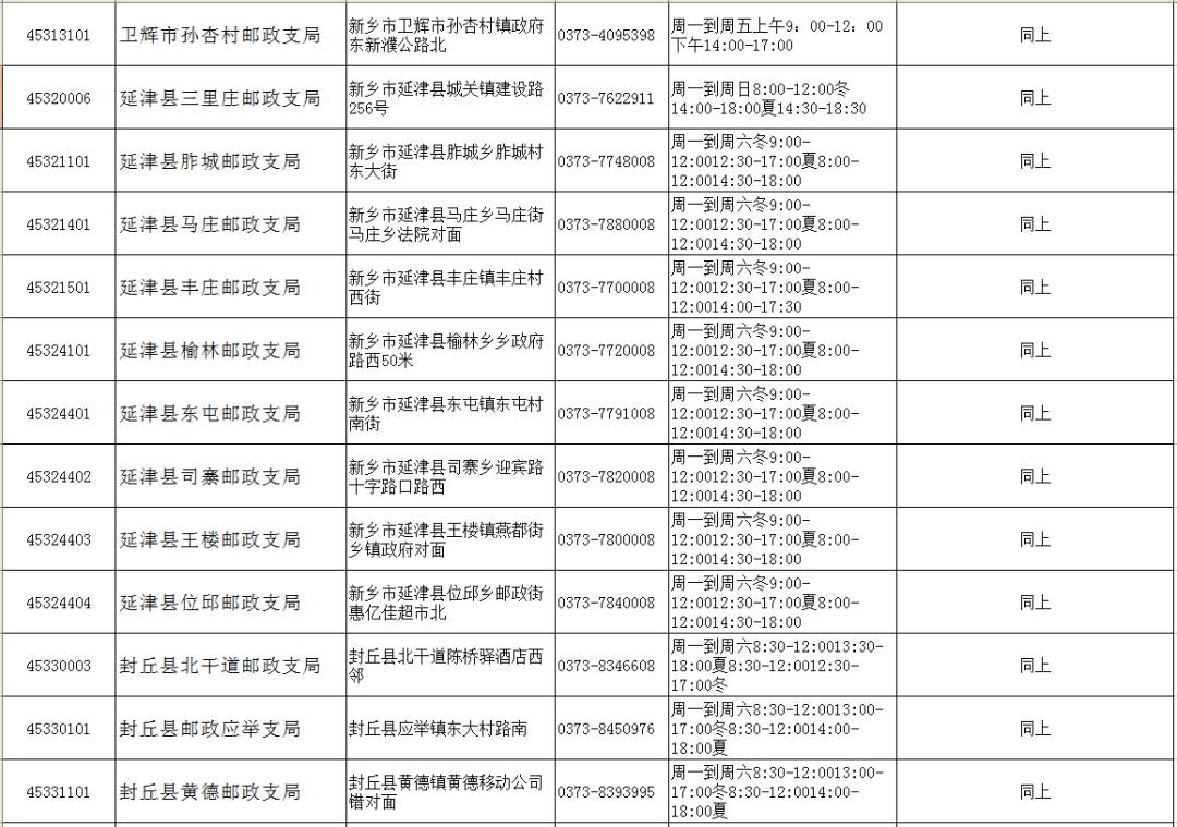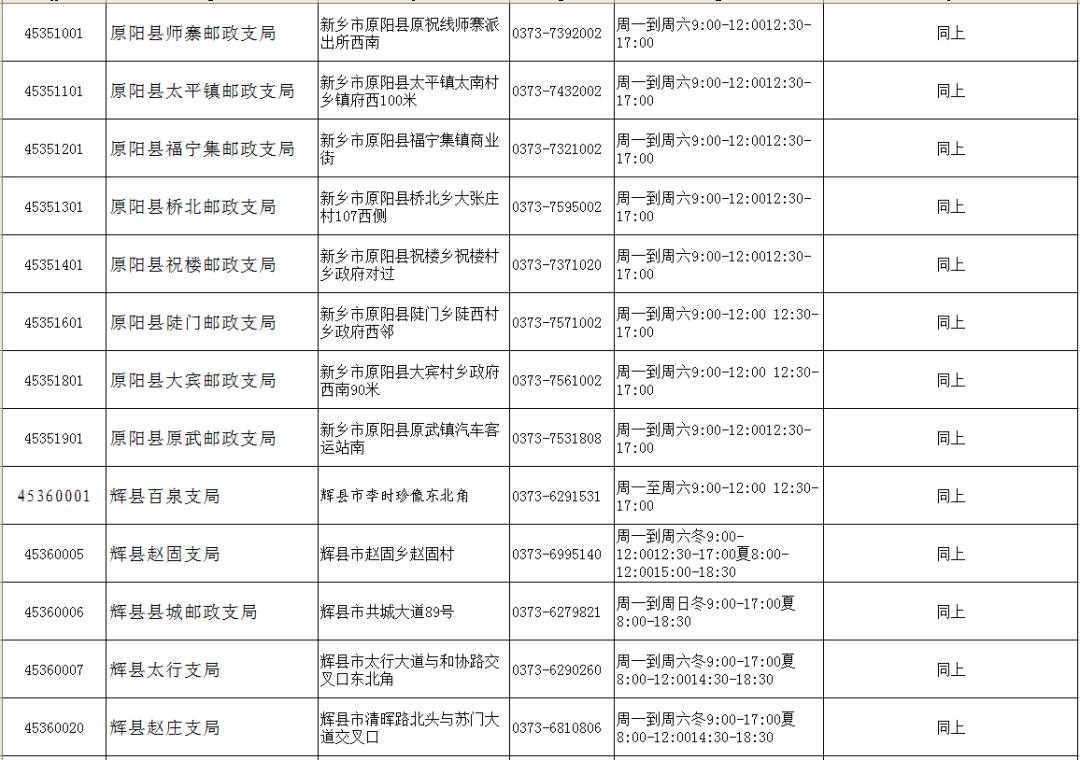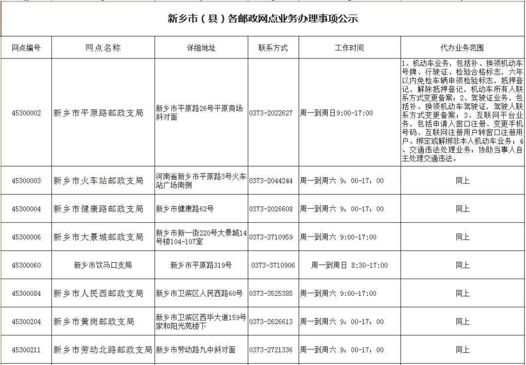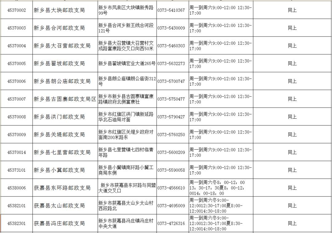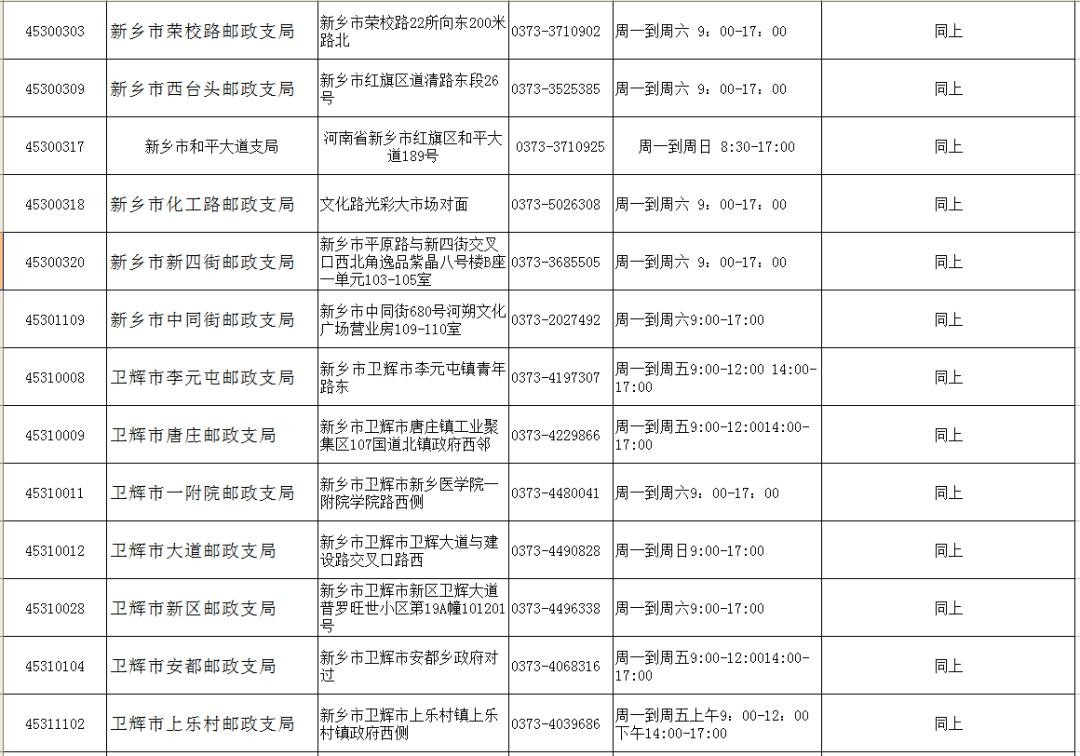 新乡市(县)各邮政网点