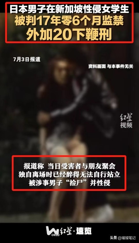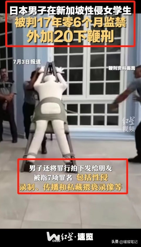 根据红星新闻7月4号报道,在新加坡工作的日本理发师,性侵了一名20岁的醉酒女生,还把侵害过程拍了下来发给朋友,他的恶行受到了新加坡司法机关严惩,获刑 17 年,外加鞭刑 20 下,这下可有他好受的了。