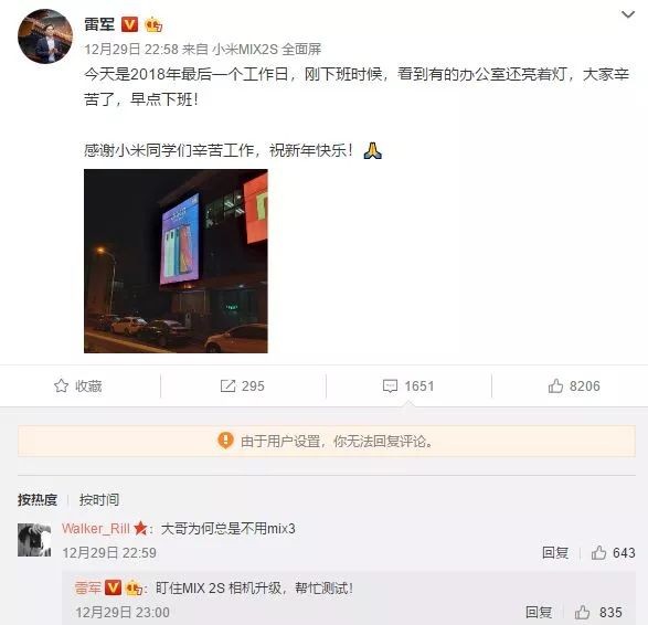 昨日晚间,雷军用小米MIX 2S深夜发文表示“刚下班时候,看到有的办公室还亮着灯,大家辛苦了,早点下班。感谢小米同学们辛苦工作,祝新年快乐”以此来表达对小米员工的慰问。在微博评论区,有网友也问“大哥为何总是不用MIX 3?”而雷军则回复称“盯住MIX 2S相机升级,帮忙测试!”原来这才是雷军不用MIX 3的理由。看来MIX 2S的拍照能力值得我们继续期待。