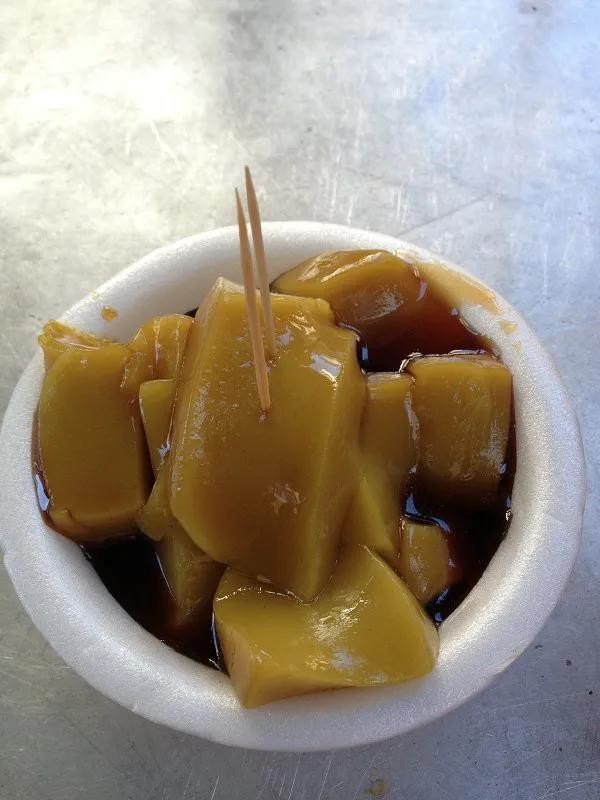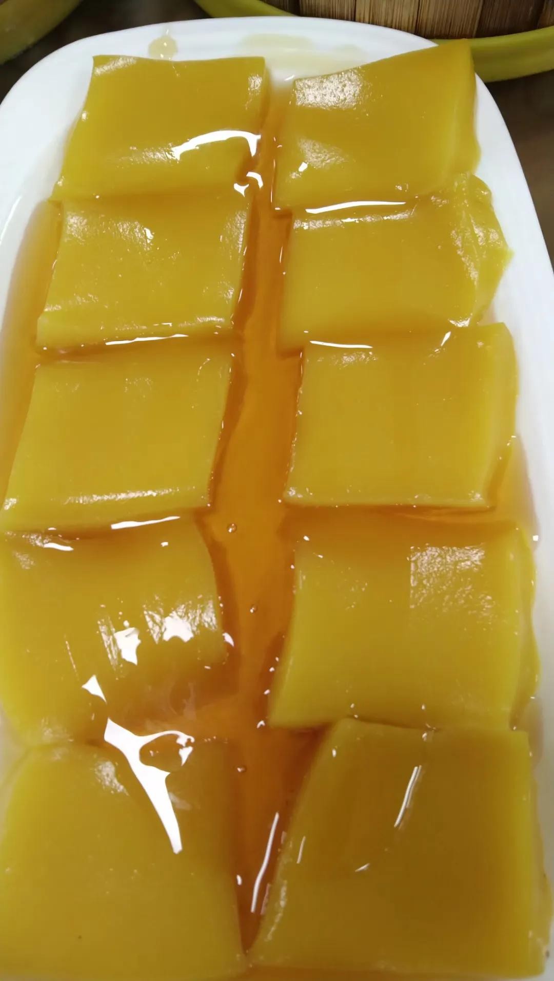 食用时可用刀切或白细线割成四方小块,加上糖浆或直接沾糖即可享用。味道甜而不腻、香甜软糯,不沾牙。听说对胃也很好哦。