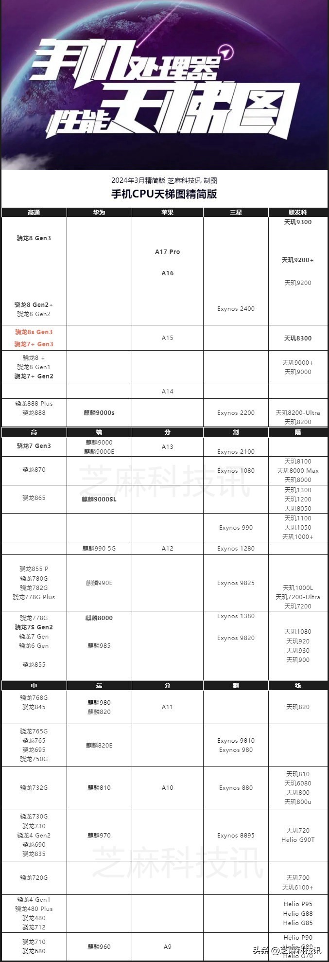 而本月,高通发布了两款新Soc,天梯图终于有新变化了。以下是芝麻科技讯制作的手机CPU天梯图 2024 年 3 月最新精简版。