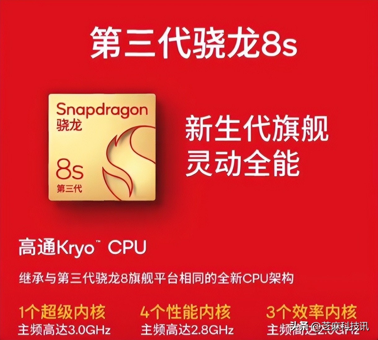 骁龙8s Gen3最大的亮点在于,采用与骁龙8 Gen 3旗舰芯片一样的台积电4nm工艺制程,相同的CPU架构(主频规格更低)等,功耗表现出色。