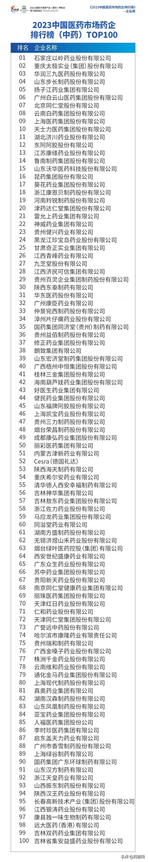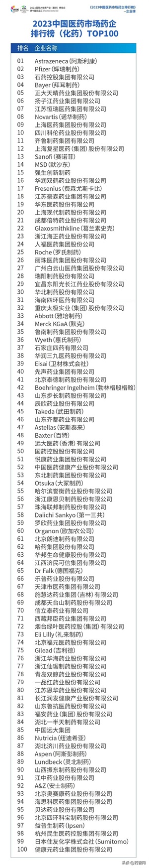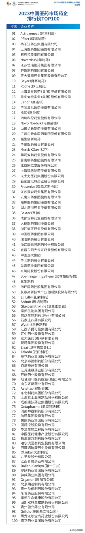 中国医药市场药企排行榜TOP100