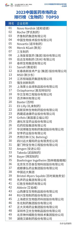 生物药榜前三甲分别为诺和诺德、罗氏制药、齐鲁制药。