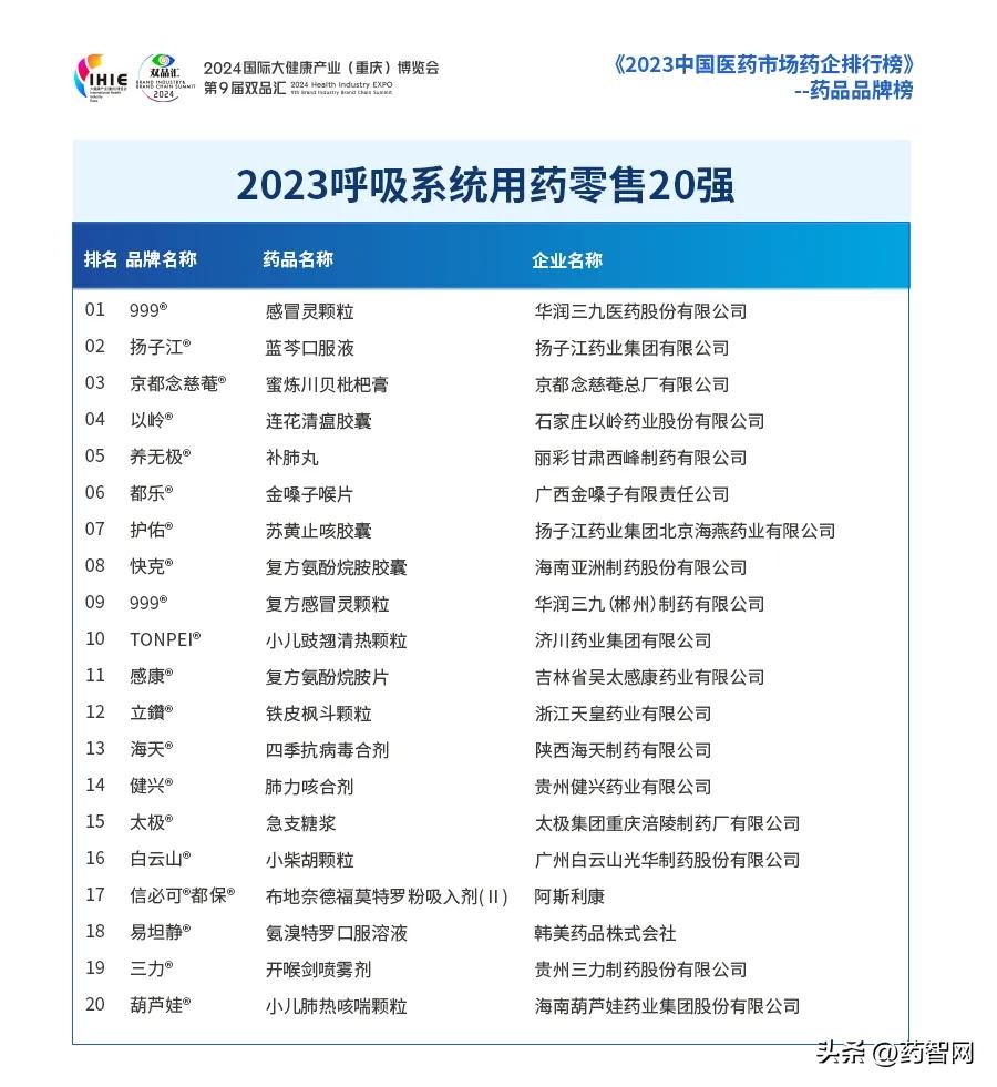 《2023呼吸系统用药零售20强》前三甲分别为:999感冒灵颗粒、扬子江蓝芩口服液、京都念慈菴蜜炼川贝枇杷膏。
