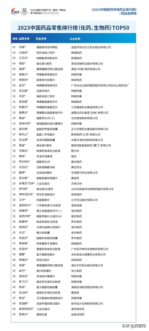 《2023中国药品零售排行榜(化药、生物药)TOP50》前三甲分别为:可威磷酸奥司他韦颗粒、立普妥阿托伐他汀钙片、万艾可枸橼酸西地那非片。