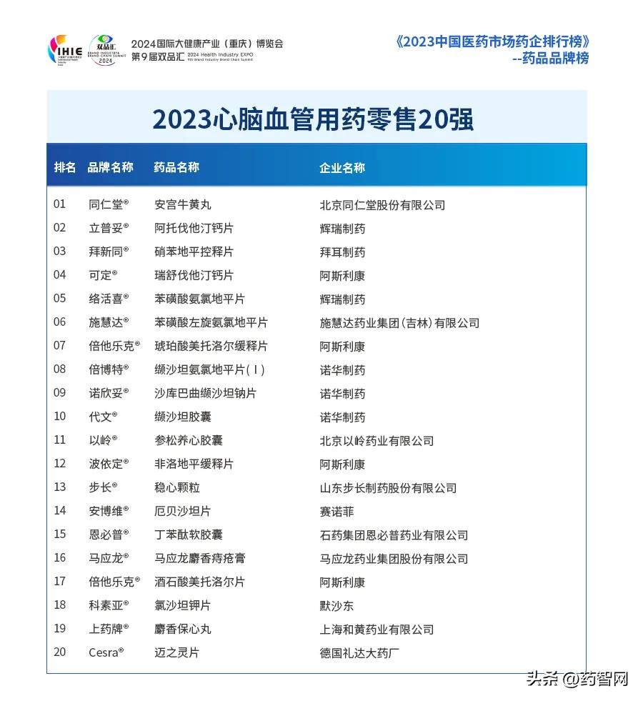 《2023心脑血管用药零售20强》前三甲分别为:同仁堂安宫牛黄丸、立普妥阿托伐他汀钙片、拜新同硝苯地平控释片。