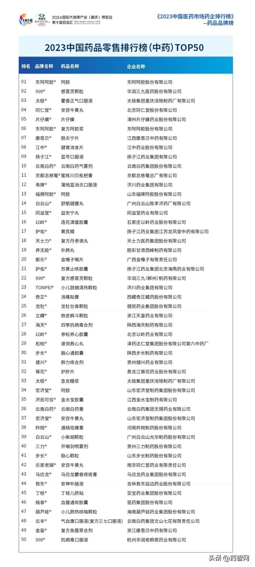 《2023中国药品零售排行榜(中药)TOP50》前三甲分别为:东阿阿胶阿胶、999感冒灵颗粒、太极藿香正气口服液。