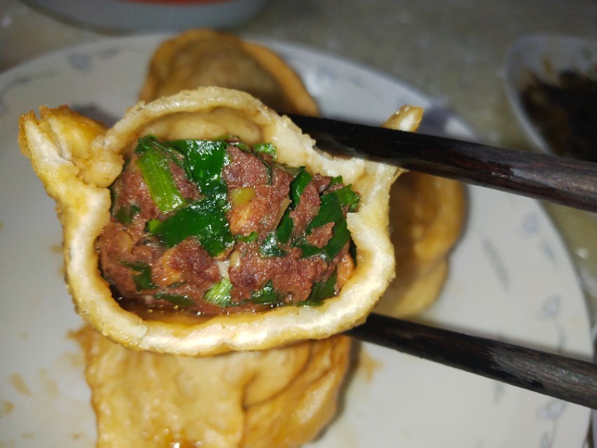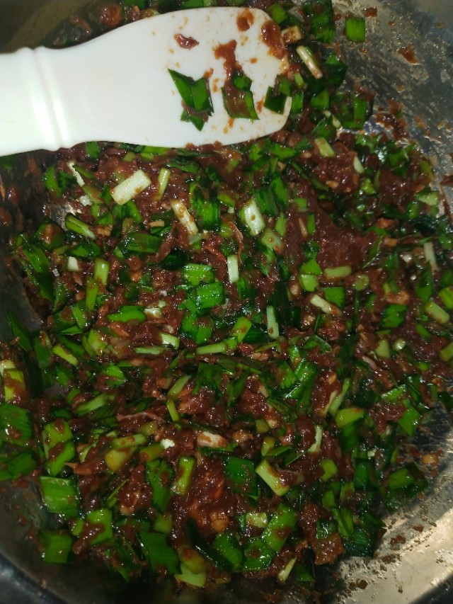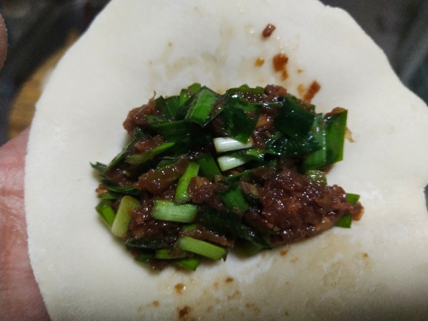 1,牛肉多成馅,拌入葱姜末,黄酱,耗油,花椒油,胡椒粉,香油,盐。包制前加入韭菜。