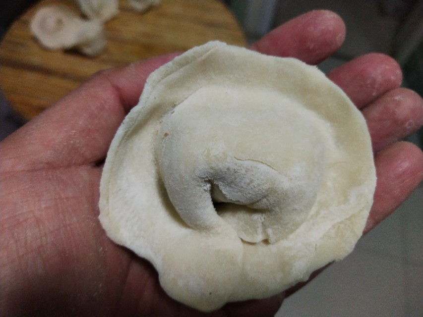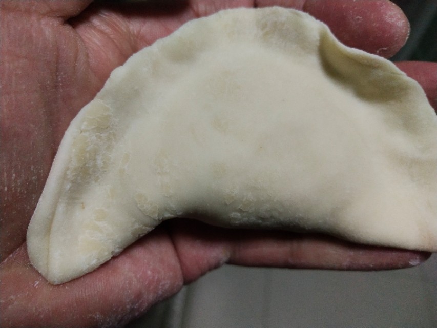 2,和面揪成剂子,擀成大饺子皮,放上馅。