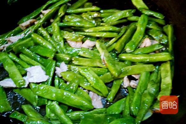 6.炒至肉片变色,倒入芸豆继续煸炒,放生抽,蚝油及少量盐,一点点水翻炒均匀,盖上锅盖焖二三分钟