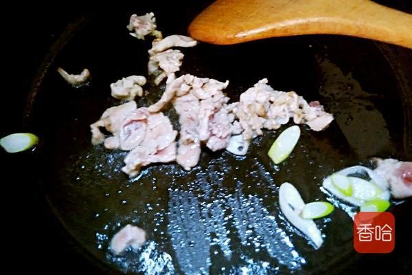5.放葱姜煸炒,放肉片煸炒