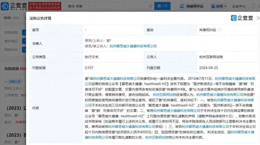 公告显示,该公司运营的微信公众号发布了标题为“医疗新资讯||一言不合就瘫着‘葛优躺’对身体可不好”的配图文章,葛优认为该文章未经其许可擅自使用其形象进行商业宣传,侵害其肖像权,向法院提起诉讼。法院审理认为,霍思威公司侵犯了葛优的肖像权,判决该公司公开道歉并赔偿葛优经济损失4000元。