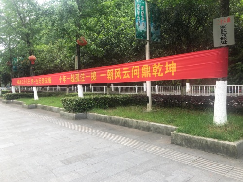 这估计是4月份挂出来的。其意是激励高三学子们继续保持,关键时刻来掉链子。不差这30多天,咬咬牙。高考是你唯一的机会,把全身心调整到位,集中精力打好三天的恶战。这里用了一个博字,我很奇怪,怎么不用搏字呢。再往前走,一左一右各挂一条,左边是“物我两忘,天道酬勤,不赢高考非英雄,挥泪洒血誓成功”。显然,本句重点在“不赢高考非英雄,挥泪洒血誓成功”,以成绩论英雄的理念显现无遗。右边一条内容是“韶华如水逝匆匆,奋力一搏方始终 青灯黄卷志踌踌,一纸功名造极峰”。这句里也有一个搏字,与第一句的博不同,为什么会不一样咧。博有取得的意思,即最多备考不要三心二意,要做到物我两忘,换来我努力了,尽力了,不会留下遗憾。那如果用上搏字,就有只此一路,太过负面。其实,第一句里的博依然会让人想到赌博这个词,我个人认为把博改成搏,有进取、拼搏之意,比欲说还羞的博还是更正面。