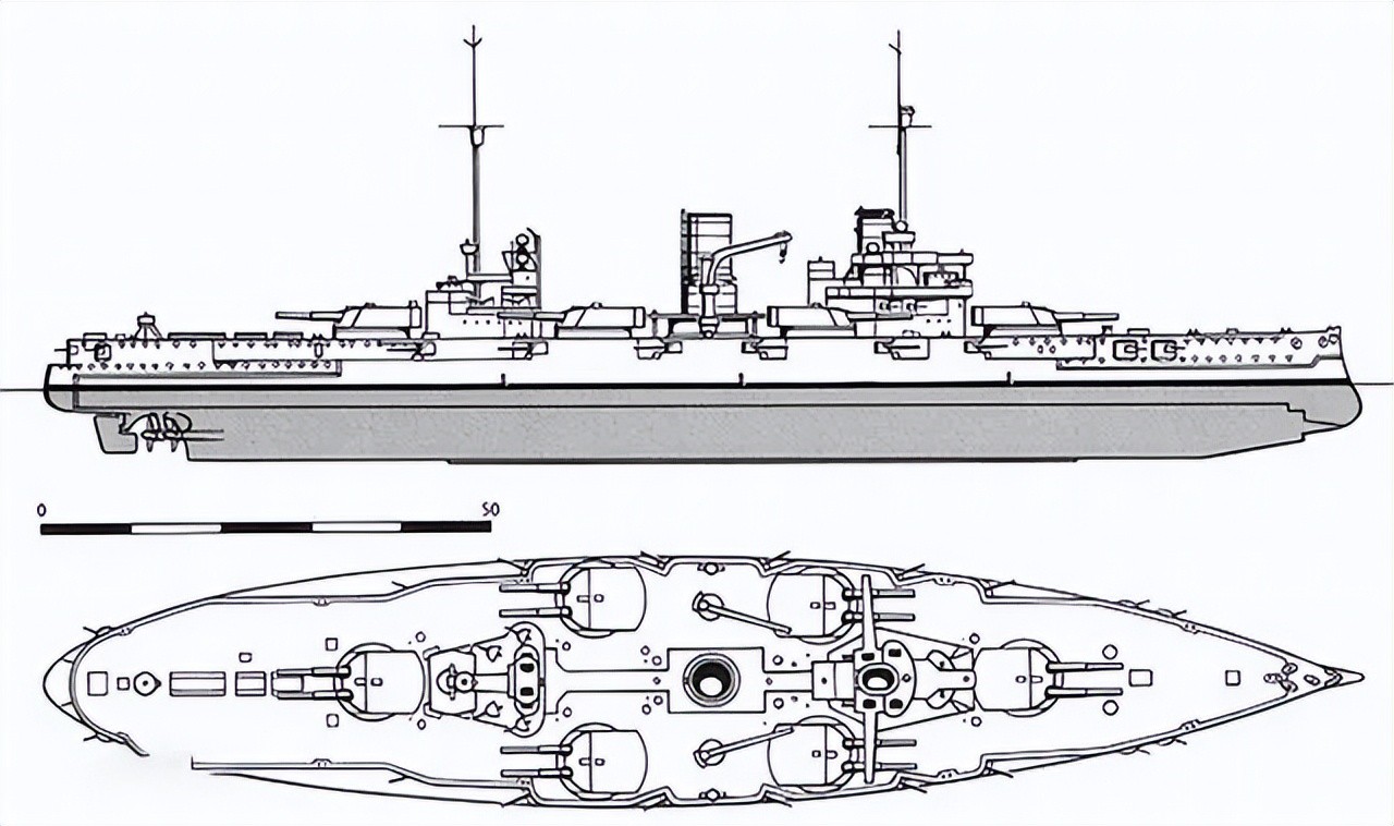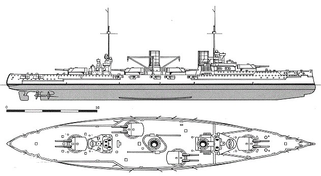 塞德利茨号,建成于1913年,1919年自沉于斯卡帕湾。装备10门283mm口径主炮,标准排水量2.5万吨,最高航速26.5节。该舰在日德兰海战中编入战巡编队,并与其他舰合力击沉玛丽女王号战巡。