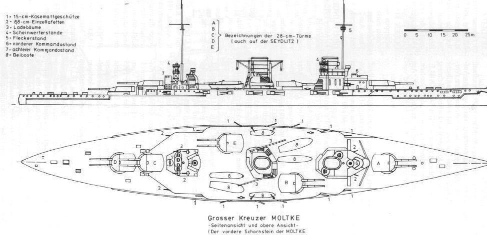 毛奇级2艘(毛奇号、戈本号),装备10门283mm口径主炮,标准排水量2.3万吨,最高航速25.5节。本级舰是对冯德坦恩号的改进型,增强了防御和火力。建成服役于1911-1912年,毛奇号1919年自沉于斯卡帕湾,戈本号于1914年转交给土耳其,并在土军服役至1947年。毛奇号在日德兰海战中编入战巡编队。