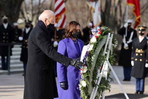 在国会大厦总统厅签署了三份文件之后,拜登检阅了军队,然后前往阿灵顿国家公墓,与前总统奥巴马、克林顿和布什一起参加献花圈仪式。