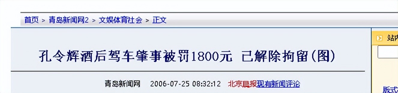 信息来源《孔令辉酒后驾车肇事被罚1800元 已解除拘留(图)》——青岛新闻网