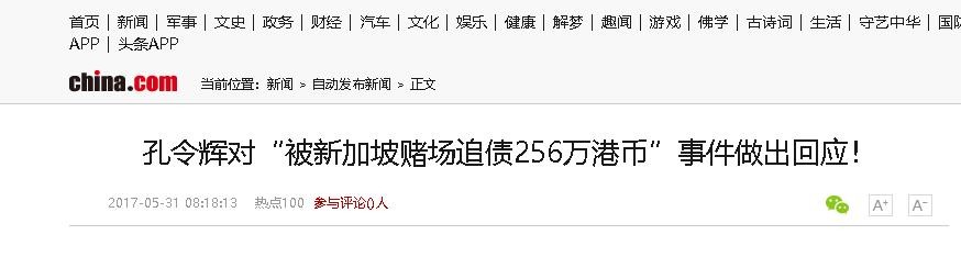 信源《孔令辉对“被新加坡赌场追债256万港币”事件做出回应!》——中华网
