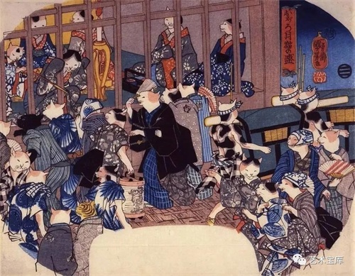 歌川国芳为了避开政府的审查,把猫拟人化,猫穿着人的衣服,做着人做的事情,以猫为载体来表现当时江户平民百姓的日常生活。这些“猫人”的表情、动作跟现实中的人一模一样,很有生活情趣。