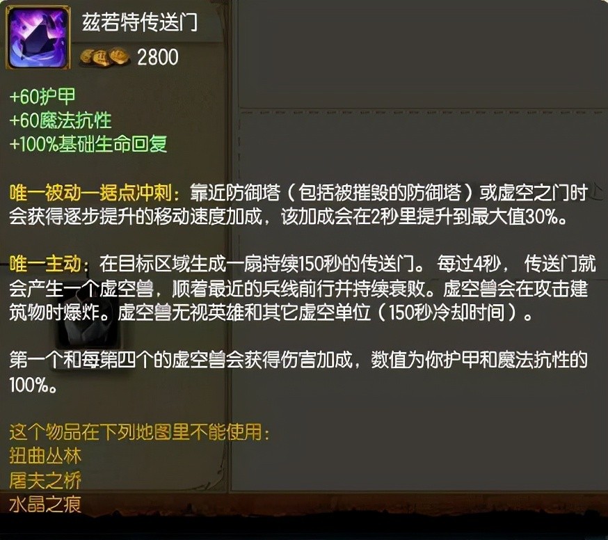 这是很多上单英雄喜欢出的装备,尤其是诺手,当时诺手们几乎人手一件,而且这个装备非常恶心,不但加了极高的双抗,而且还会召唤出虚空生物去拆塔清兵,伤害还挺高,小编就曾经被传送门偷过家,最后也是被拳头给删除了