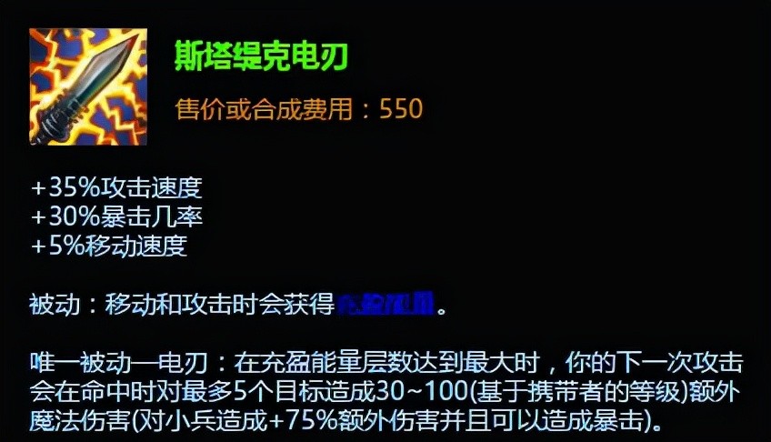 这个大家再熟悉不过了,也叫做电刀,当年的被购买率可以说是联盟之最,虽然伤害不是很高,但是爽啊,大部分AD类职业都非常喜欢这件装备,尤其是压缩和蛮王,当然这件装备也是被拳头给无情删除了,真是太可惜了