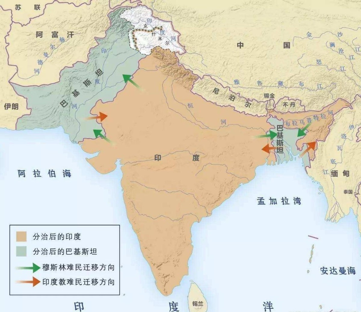 这还要从源头“印巴分治”开始说起,某种意义上,都是当初大英帝国埋下的雷。由于二战结束后,第三世界国家兴起了民族独立解放运动,处于英国殖民地的印度也要求独立,在“圣雄”甘地等人对英国殖民政府开展“不合作运动”的带领下,大英帝国统治下的英属印度最终独立,但是英国人此时又发挥出他们的传统“搅屎棍”手段。1947年,英属印度最后一任总督蒙巴顿提出印巴分治方案又称蒙巴顿方案,被英国议会批准,根据宗教信仰差异,把英属印度主要分为印度和巴基斯坦两个地方,因此很多地区被分割,其中巴基斯坦又有东巴和西巴两部分。英国这么做的目的很明显,就是为了防止南亚次大陆上完整的势力出现,从而达到分而治之的目的。