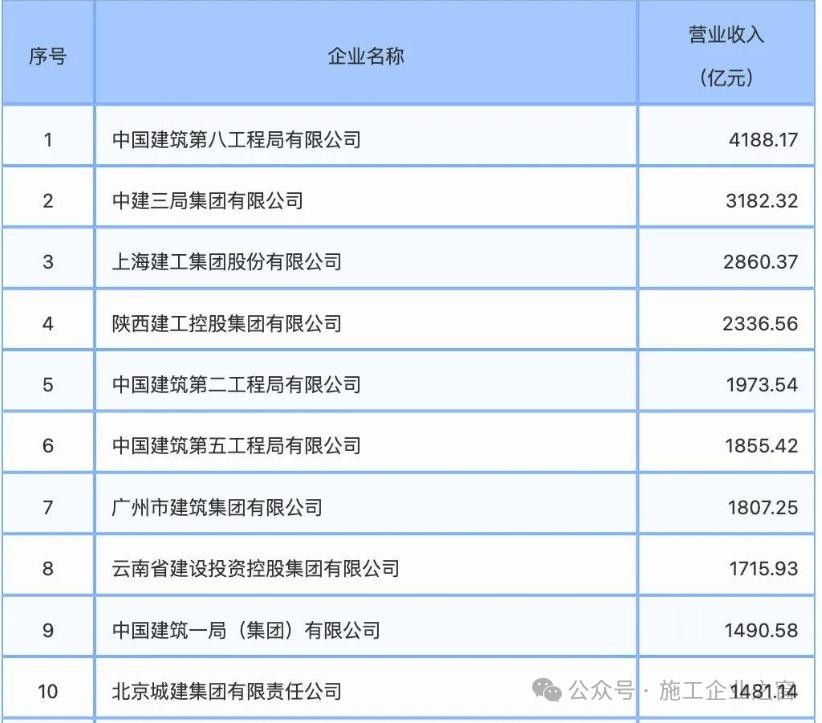 2023年建筑业企业营业收入10强榜单