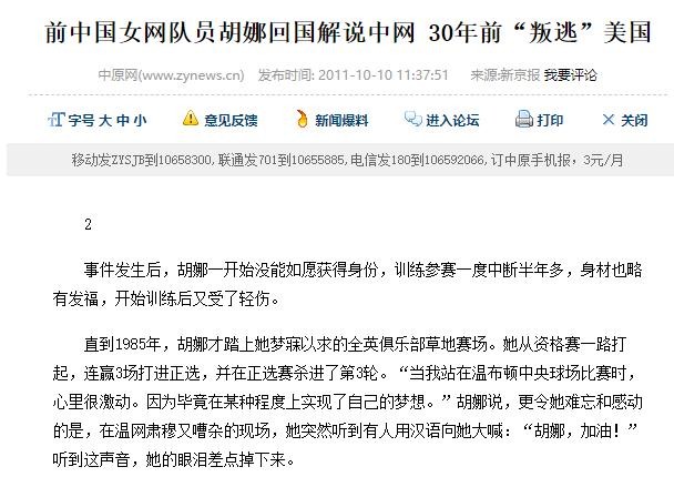 中原网 2011-10-10 前中国女网队员胡娜回国解说中网 30年前“叛逃”美国