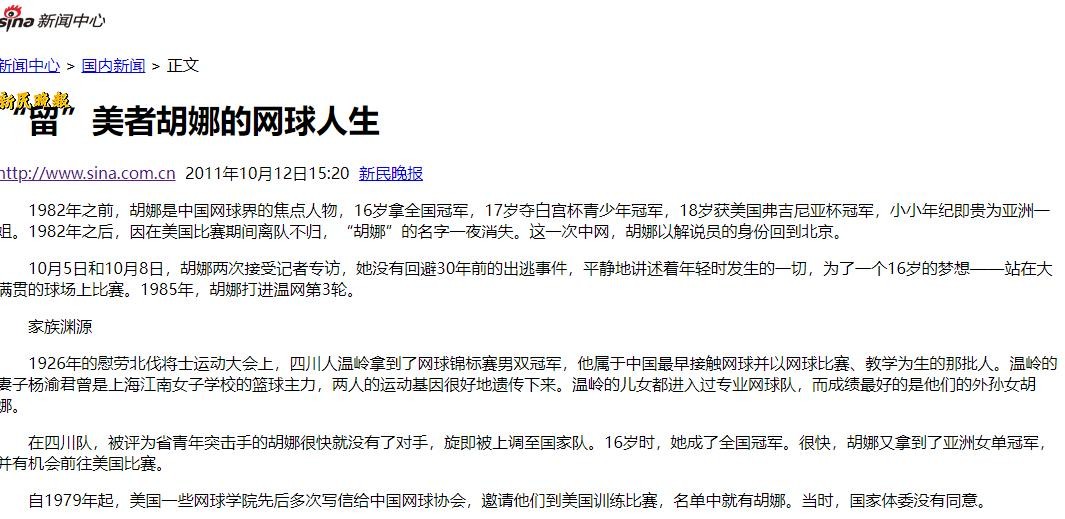 信源来自:新浪新闻 2011-10-12 “留”美者胡娜的网球人生