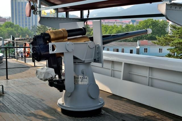 清朝政府国衰民弱,在甲午海战中,定远号在威海保卫战中不幸被日军鱼雷艇偷袭重伤后搁浅,搁浅后的定远舰只能充当浮动炮台, 定远舰用舰艉150毫米克虏伯副炮还击,当时击毁了日军前来偷袭的“第九号”鱼雷艇。
