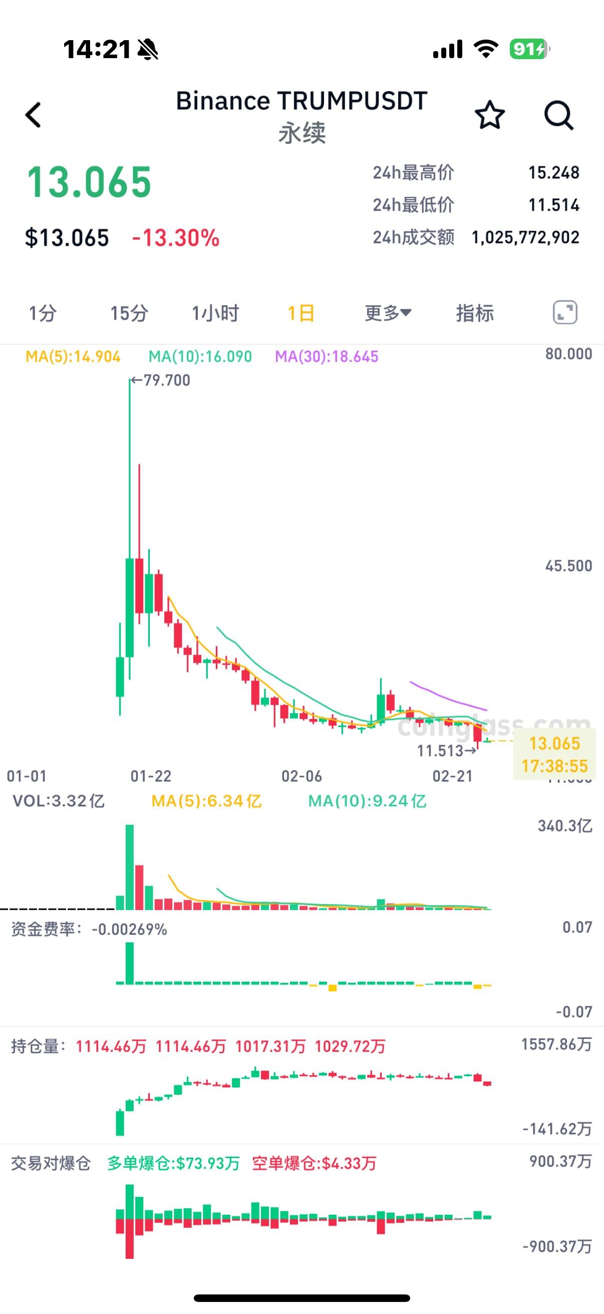 比特币交易所的清算数据表明,如果比特币价格进一步下跌至85000美元,预计还将有约8亿美元的多头仓位被清算。其他代币的表现也同样不佳,其中狗狗币(DOGE)下跌9.15%,XRP下跌8.65%,SOL下跌11.9%。特朗普的Solana MEME币(TRUMP)一度跌至11.513美元,创下该代币自1月首次亮相以来的最低价,目前该代币已从73美元的高点下跌了超过85%。