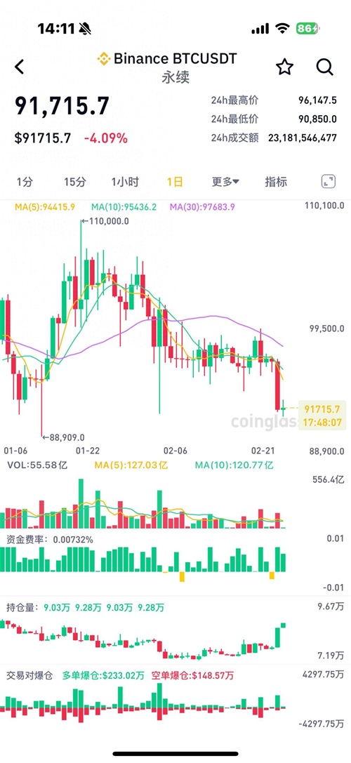 比特币价格经历了一次剧烈的闪崩。2月24日晚,比特币首次跌破95000美元关口,随后进一步下探。根据最新行情数据,比特币在短短一小时内从94000美元急速下挫至90880美元,24小时内跌幅扩大至近4%,远超市场预期。这一暴跌不仅刷新了自2月3日清算以来的最大单日跌幅,还引发了加密货币市场的连锁反应,全网28.4万人爆仓,约8.82亿美元资金“蒸发”,美股加密货币概念股同步下跌,市场恐慌情绪迅速蔓延。