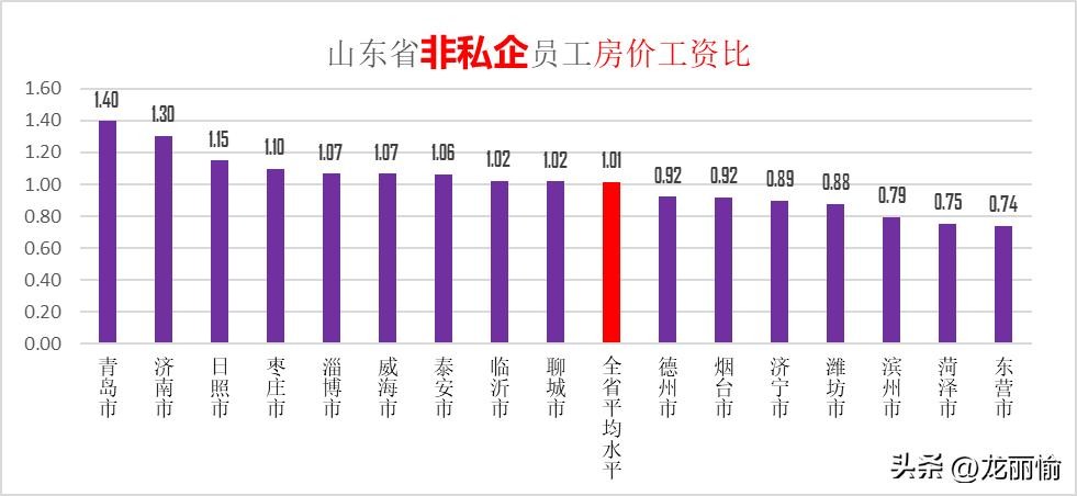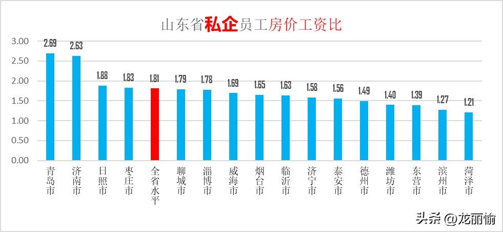山东省私企员工“房价与月工资比”为1.81,非私企员工的“房价与月工资比”为1.01,也就是说,山东省在私营单位就业的员工,其购房压力整体要比在国企、事业单位就业人员的要大。