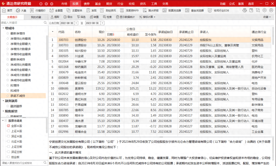 股东增减持也是值得关注的情况,交易提示专题中根据不同角度,分别统计近一月/三月/六月/一年最新净增持、净增持比例最高、净增持金额最大、净增持次数最多、净增持收益最高、最新净减持、净减持比例最高、净减持次数最多、净减持收益最高的股票。也有公告拟增持、拟减持、承诺不减持公司的汇总,能看到公告详情和公告后的至今涨幅。