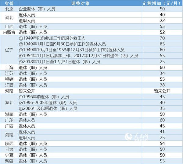 表:19省份2019年退休人员基本养老金定额调整情况一览
