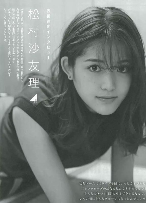 松村沙友理,日本歌手,女子组合乃木坂46成员之一,毕业于大阪桐荫高等学校。因为出生在大阪,所以全身都散发着“关西人”的气场。在歌迷中与白石麻衣、桥本奈奈未合称为乃木坂46的“御三家”。