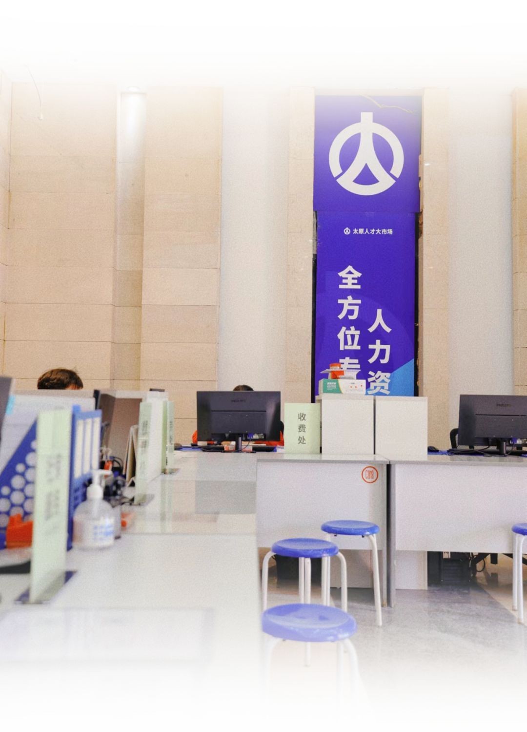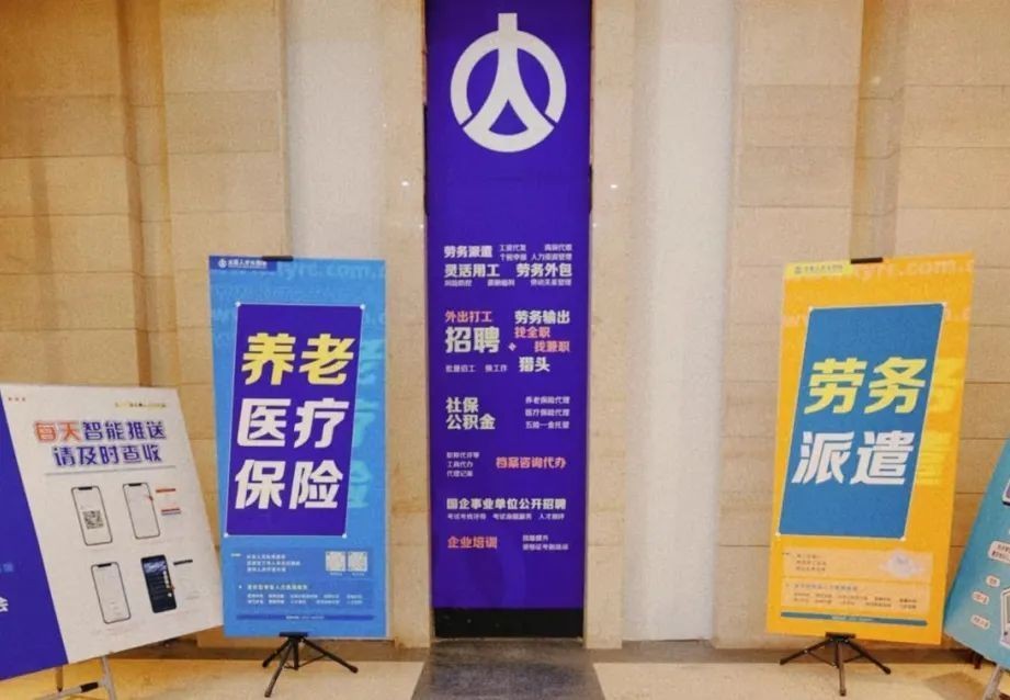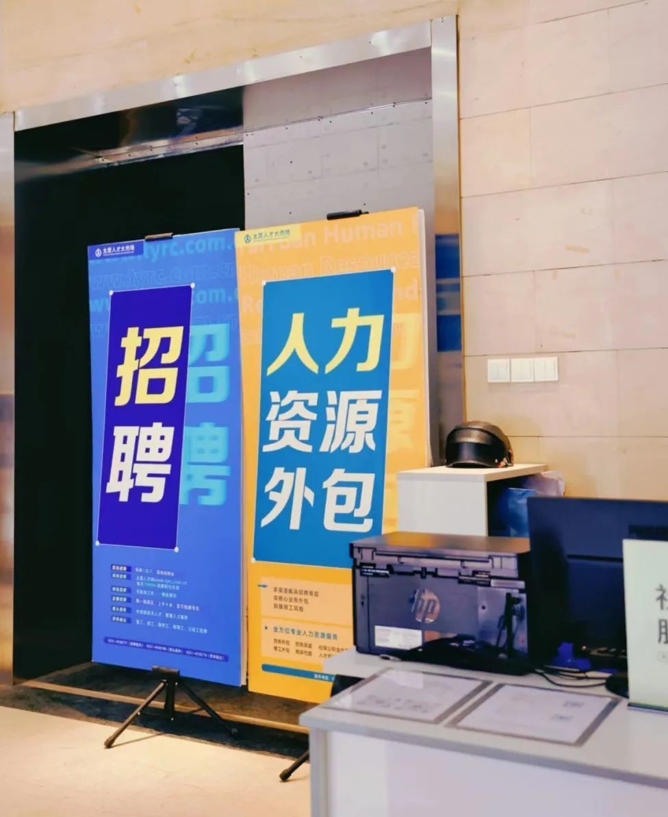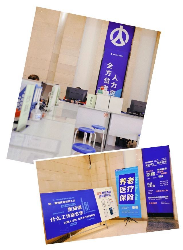 太原人才大市场一楼大厅左侧,放置多个海报展架,海报内容贴心详细;右侧为窗口服务区,有招聘服务、劳务输出、人才培训、社保公积金代理、工商代办、档案咨询代办等多个接待服务窗口,形成多层次、全方位的服务体系。