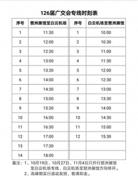 本届广交会共分三期:第一期10月15-19日,第二期10月23-27日,第三期10月31-11月4日。为给广大国际国内参展客户提供一流的交通服务,展会期间,空港快线开通了白云机场往返琶洲展馆的大巴专线。记者了解到,该专线平均发车间隔约半小时(高峰期客满即走),票价35元,全程约60分钟。其中,白云机场至琶洲展馆方向,开行12班,开行时间为10:00—15:30;琶洲展馆至白云机场方向,共14班,开行时间为11:30—18:00。需特别提醒的是,10月19日、10月27日、11月4日只开行琶洲展馆至白云机场方向,白云机场至琶洲展馆方向停开。详情可请咨询空港快线服务柜台工作人员、关注空港快线微信公众号。空港快线24小时服务热线:(020)86122102。